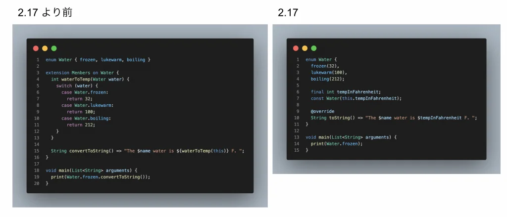 Dart 2.17 では、enum でのメンバーに対する一般的なサポートを追加します。 これはつまり、状態を持つフィールドや、 その状態を設定するコンストラクター、 機能性を持ったメソッド、 既存のメンバーに対するオーバーライドを追加することができるということです。 言語トラッカーにて3番目に高い投票数の課題だったこともあり、 多くの人がこの機能を要求していました。