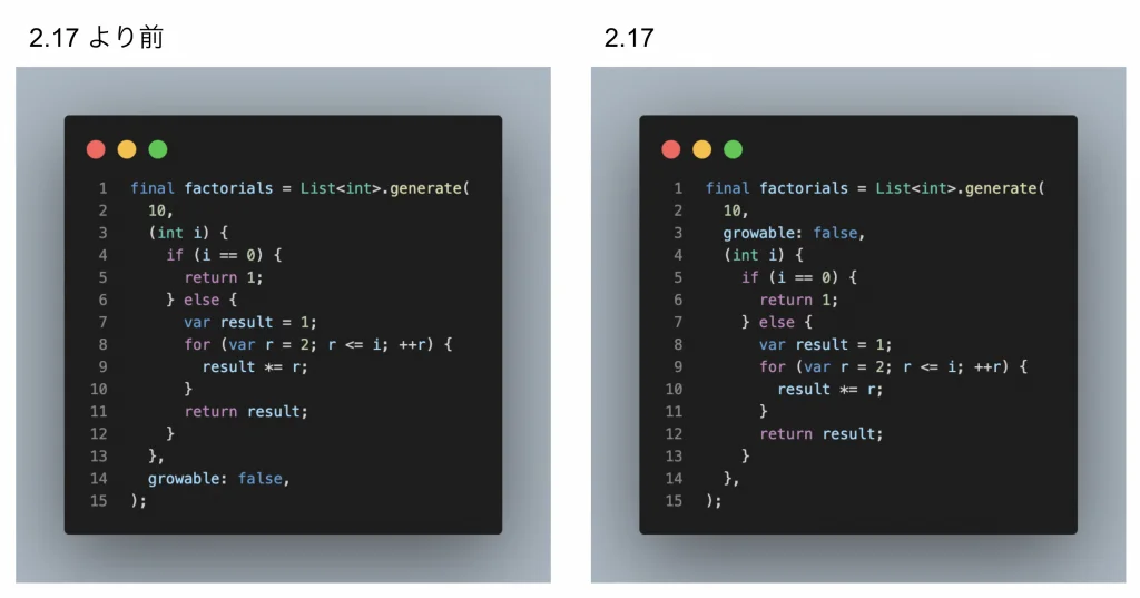 アップデートされたDart2.17のときで比較してみてください。