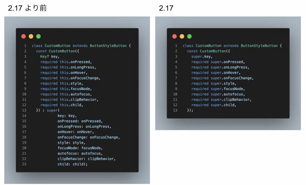 何名かのDart コミュニティのメンバーがこの事象を助けてくれました。 スーパークラスでパラメータが指定されたことを表現するための、 新たなコンストラクタを導入すれば、この問題を解決できそうだ、ということです。 これは良いアイデアだと考え、Dart 2.17で追加されました。 以下の例でわかるように、 これは特にFlutterのWidgetのコードに関連しています。 実際、この新機能をFlutter フレームワークに適用したところ、 合計で約2000行近くのコードが削減されました!