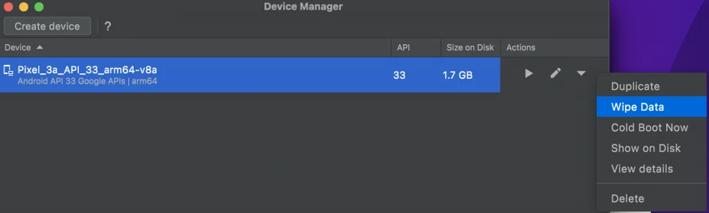 エミュレータの一覧画面です。 エミュレータの下矢印をクリック > Wipe Data を選択します。