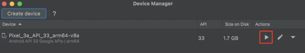 次に横向き三角の実行ボタンを押し、エミュレータを起動します。 (初回はマイクへの接続を求められるのでOKを押下します。)