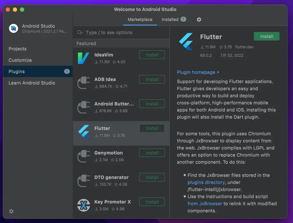 Android Studio の初期画面のPlugins を選択し、 Flutter プラグインをインストールします。