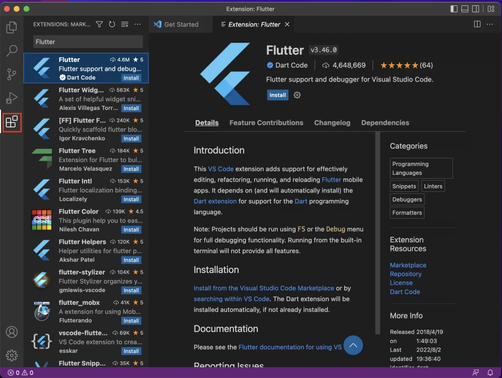 以下の画像の赤枠のボタンをクリックすると、 拡張機能の選択、インストール画面となります。 左上の検索バーで”Flutter”を検索し、Flutterの拡張機能を表示します。