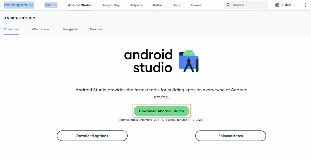 コードを書く作業やAndroidの仮想端末(エミュレータ)の使用ができるように Android Studio を導入します。
