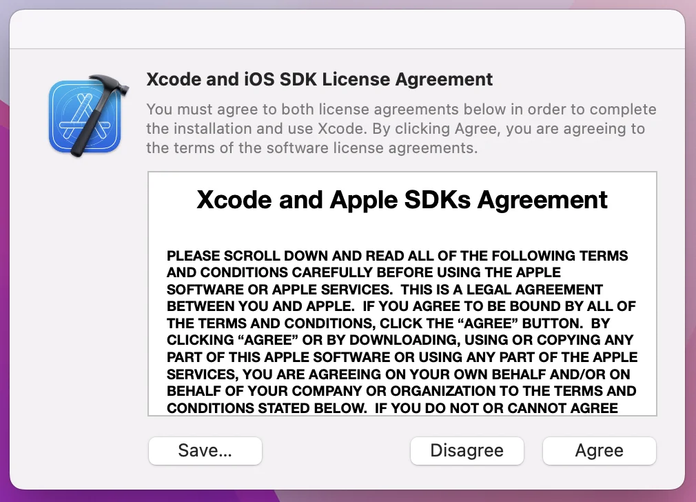 Xcode を開こうとすると、ライセンス確認のダイアログが表示されます。