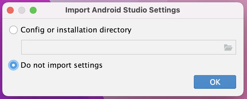 Android Studio の設定をインポートするか問われます。 今回は引き継がないので下を選択します。