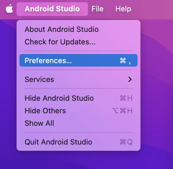 Android Studioを開き、左上のAndroidStudio → Preferencesを選択します。