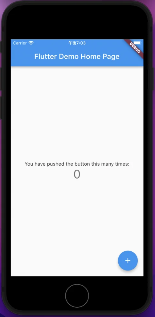 flutter create で作られるアプリは通称カウンターアプリと呼ばれます。 その名の通り、プラスボタンを押すことで真ん中の数字がカウントアップされるアプリです。