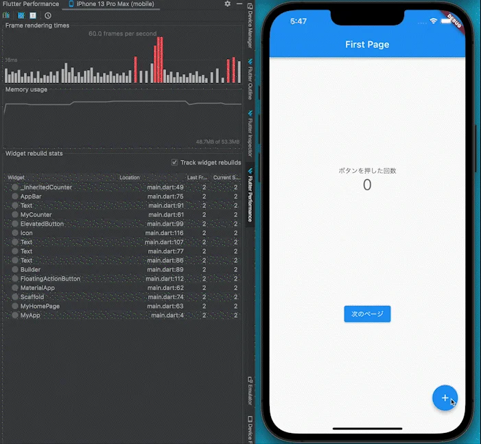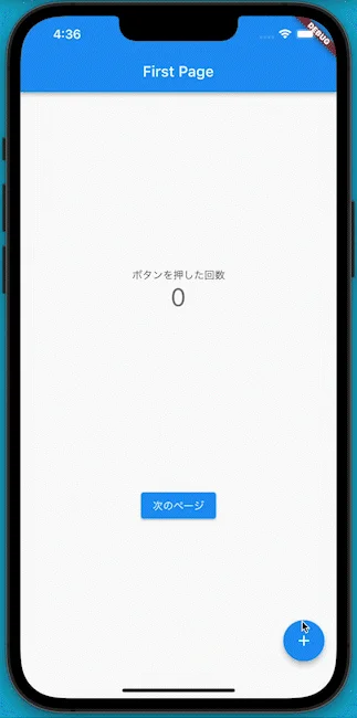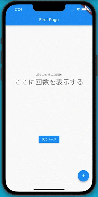 2つの画面にカウンターが設定されています。 このアプリでは、2つの画面で同じ値を状態として共有したいです。 そのため、依存関係が上のWidgetに状態(データ)をもたせる必要がある、 そんなアプリとなっています。