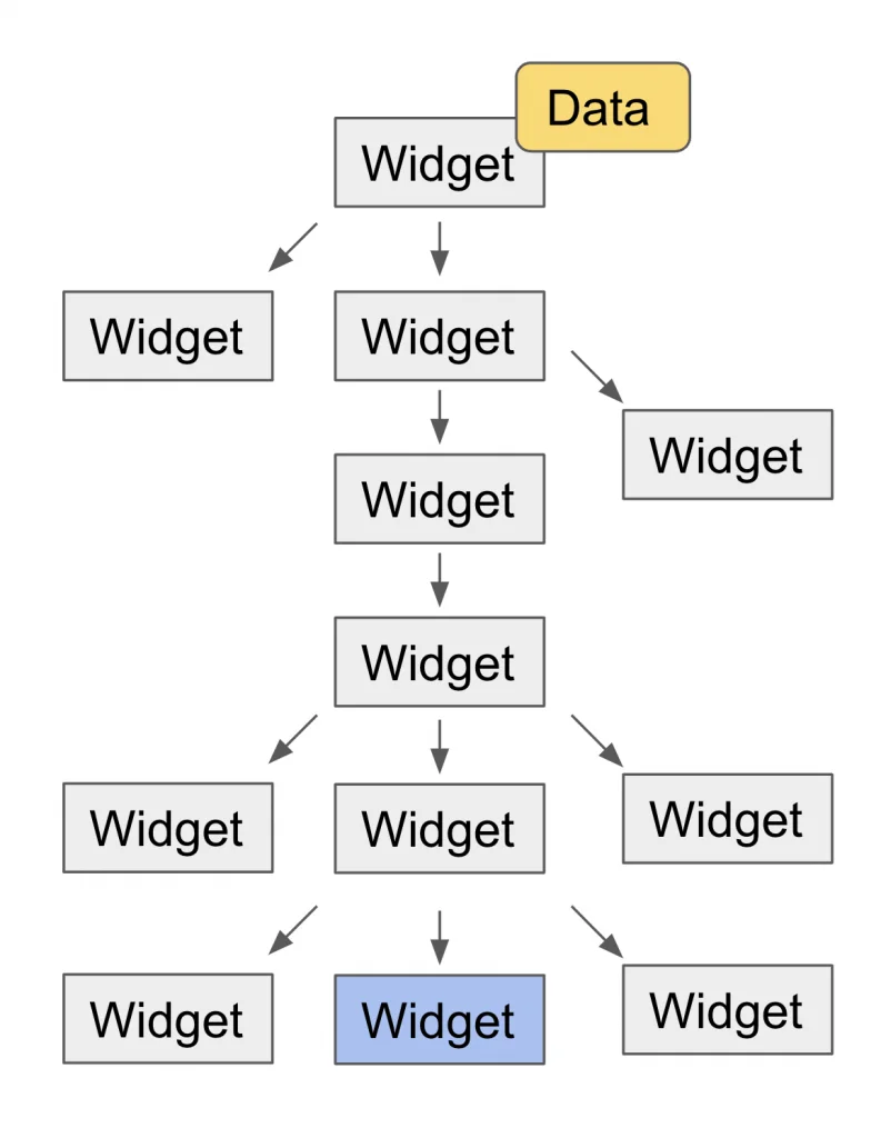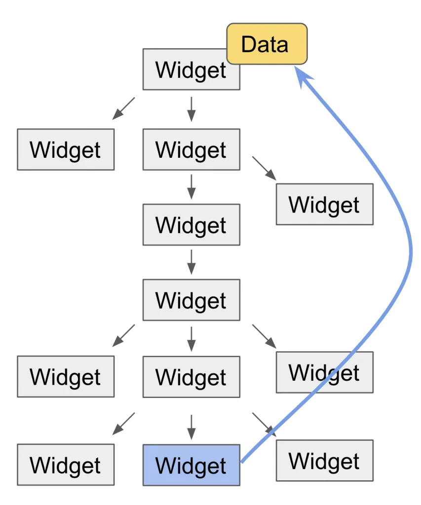 課題になるのは、最下層のWidget(水色)で最上部のWidgetが 持つデータ(黄色)を参照したい時です。