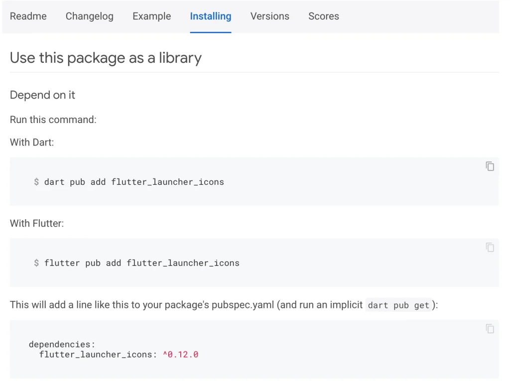 プロジェクト内の、pubspeck.yamlという場所に直接書く方法もありますが、今回はターミナルから追加する方法をやってみようと思います!flutter_launcher_icons のサイトから、Installingを選んでいただきます。