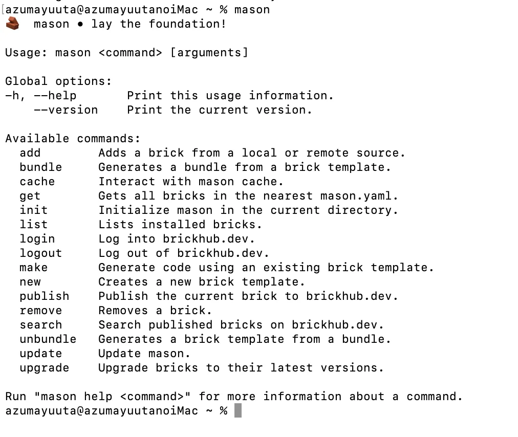 続いて、以下のコマンドで、 mason.yaml に登録されているテンプレート(bricks)をすべて取得します。