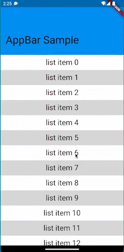 これだけで、以下のGIFのような挙動をするAppBarとなります。