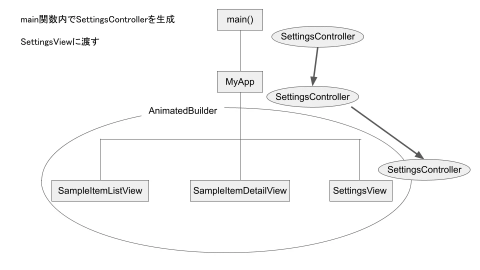 main関数内で生成し、MyApp,SettingsViewに受け渡しています。