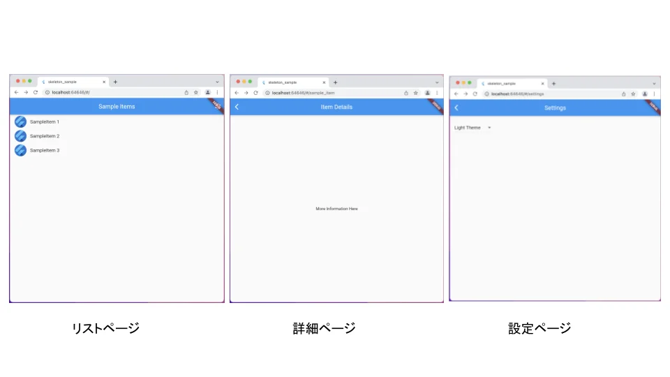 Skeletonテンプレートとは、Flutter v2.5によって追加されたFlutterのテンプレートです。 リストビューとアイテムの詳細ページ、設定ページが用意されています。