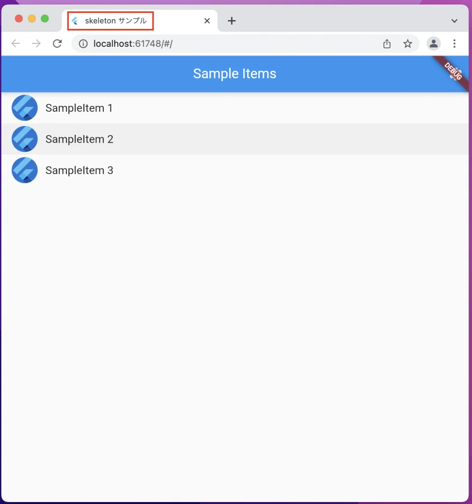 アプリをchromeで開いてみてください。 chromeのタブ部分のアプリタイトルが「skeletonサンプル」と日本語に変わっていれば成功です。