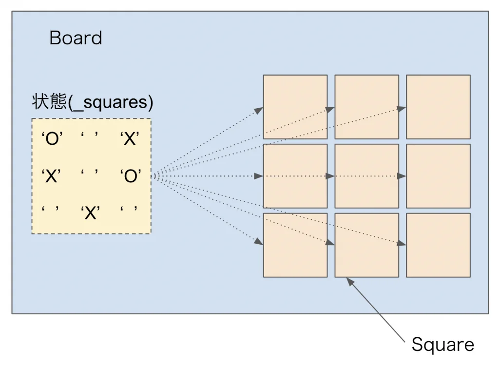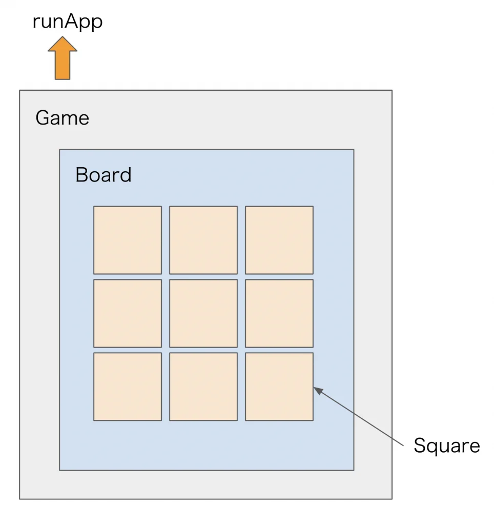 まずは、Gameの子WidgetがBoardで、さらにBoardの子WidgetがSquareになっている、