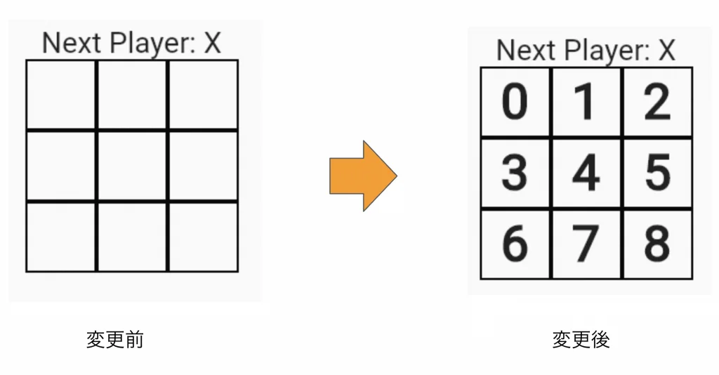 以上でエラーがなくなり、元の通りアプリを実行すると三目並べゲームが遊べる状態となります。 頑張って変更していった割に変化が少なく思うかも知れませんが、 安心してください、タイムトラベル機能の導入のためには大きな前進です。