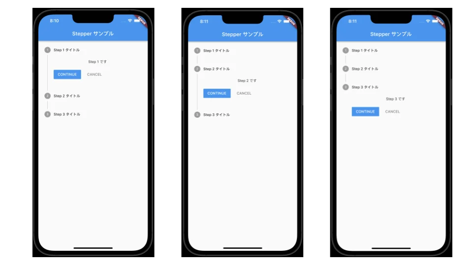 Stepperでは、CONTINUE(次へ)ボタンとCANCEL(戻る)ボタンが