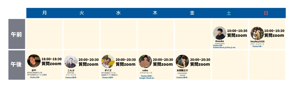 そのおかげもあり、優秀な講師メンバーに恵まれ、今回Flutter大学の質問zoomを週7に変更できました。